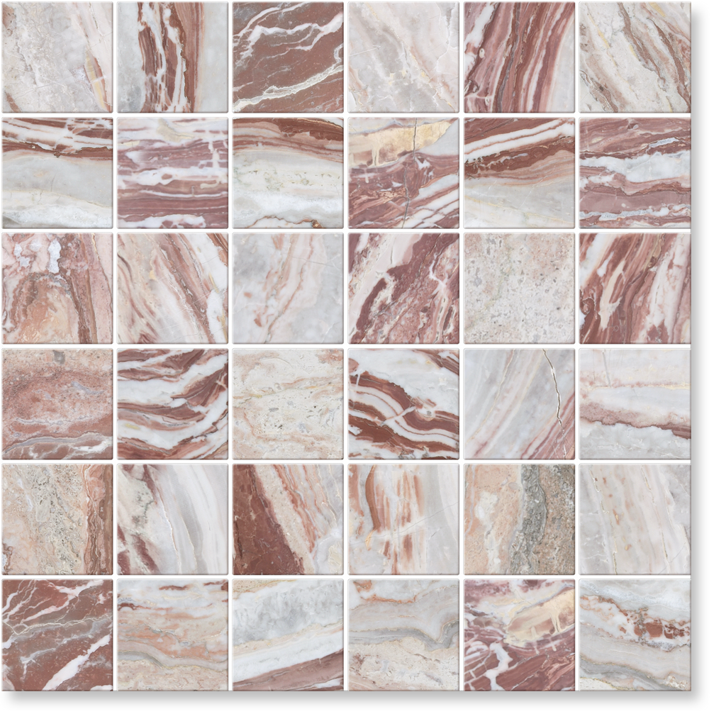 This exquisite 2" x 2" hand-cut marble mosaic features Arabescato Rosso honed, Norwegian Verde honed, Omega Black brushed, and Taj Mahal honed. The combination of varied finishes creates a sophisticated design with rich color variation and textural depth, bringing timeless elegance and visual interest to any space.