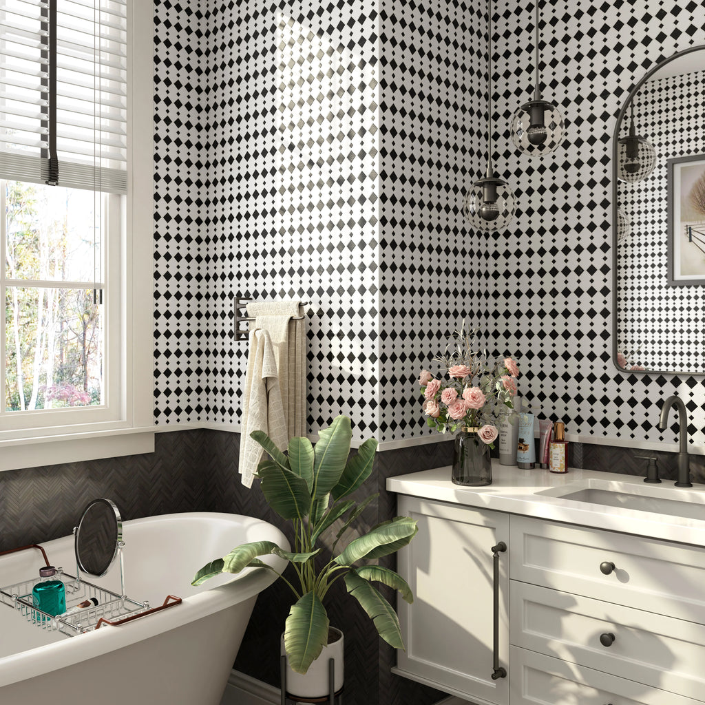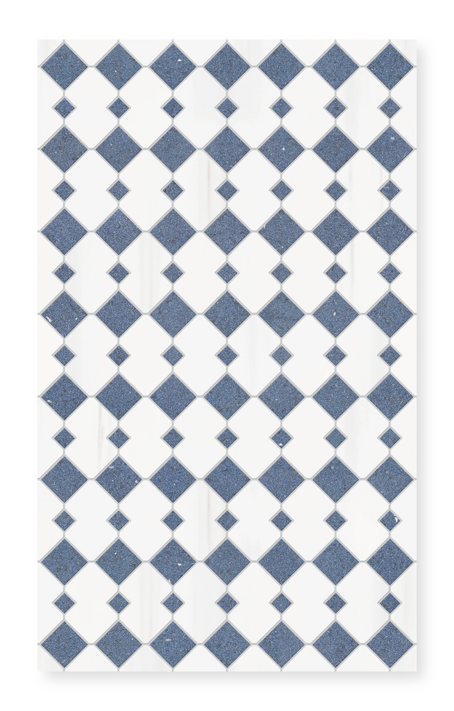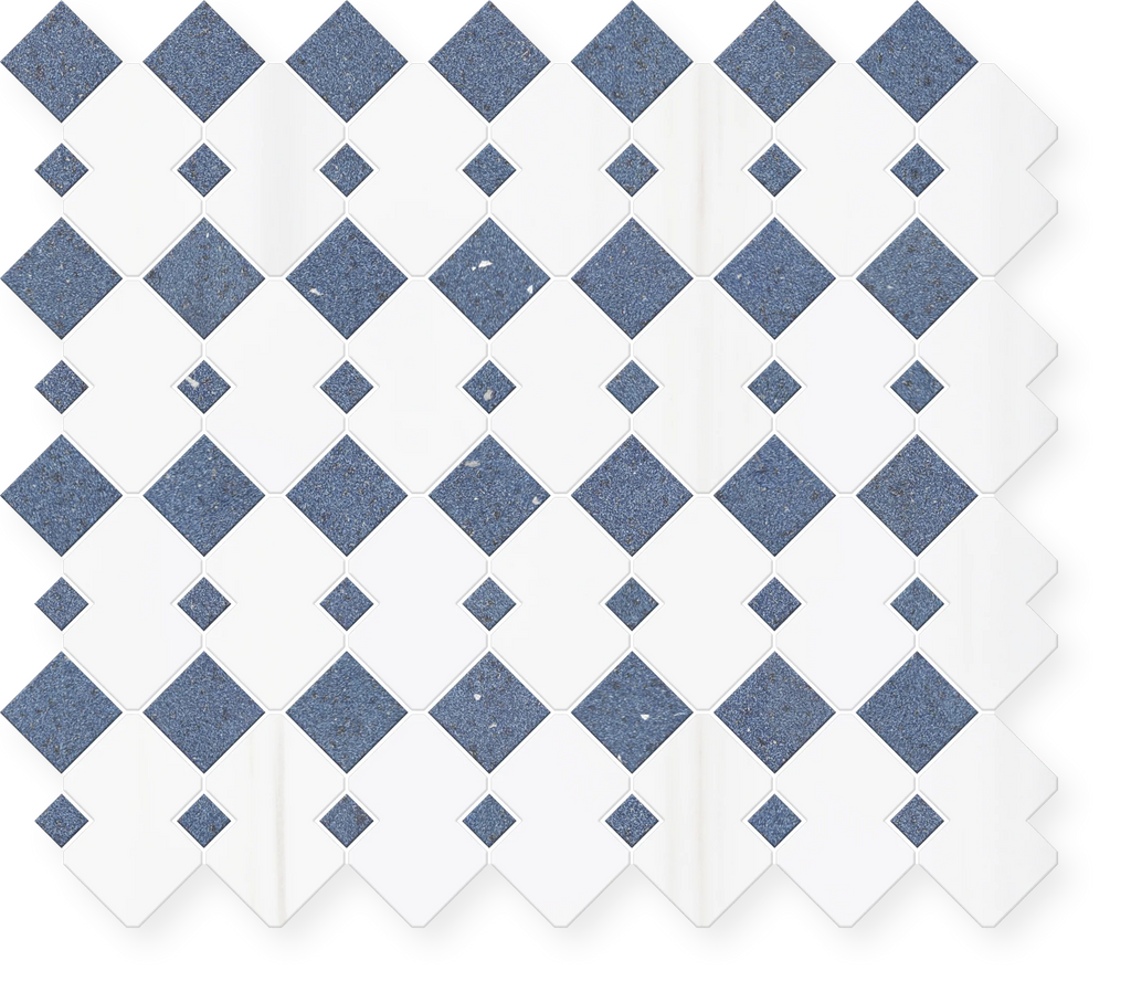Artisan. Bold. Striking. Our Acantha hand-cut marble mosaic brings dramatic beauty and exceptional craftsmanship to any space. Each piece is meticulously crafted by specially trained artisans, combining honed Bianco Dolomite, leathered Indigo, honed White Thassos, and honed China Black marble. The intricate pattern creates a stunning interplay of blue, white, and black tones that elevates interiors, floors, showers, fireplace surrounds, and exterior walls designed to make a bold statement.