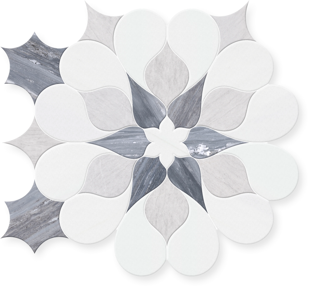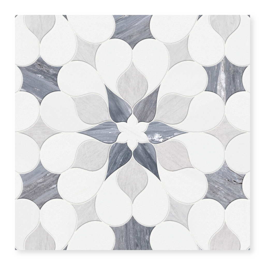 Artemis is an exquisite waterjet marble mosaic cut by high-precision machinery, delivering flawless geometric patterns and exceptional craftsmanship. This stunning mosaic combines three premium marble varieties to create a sophisticated and timeless design.