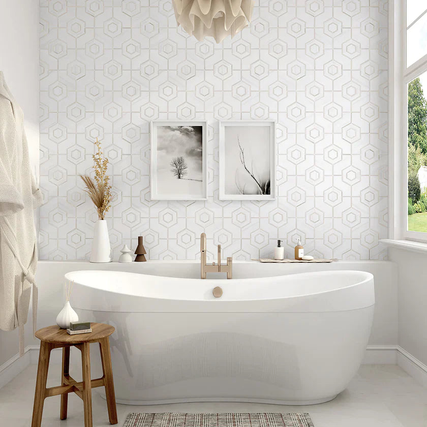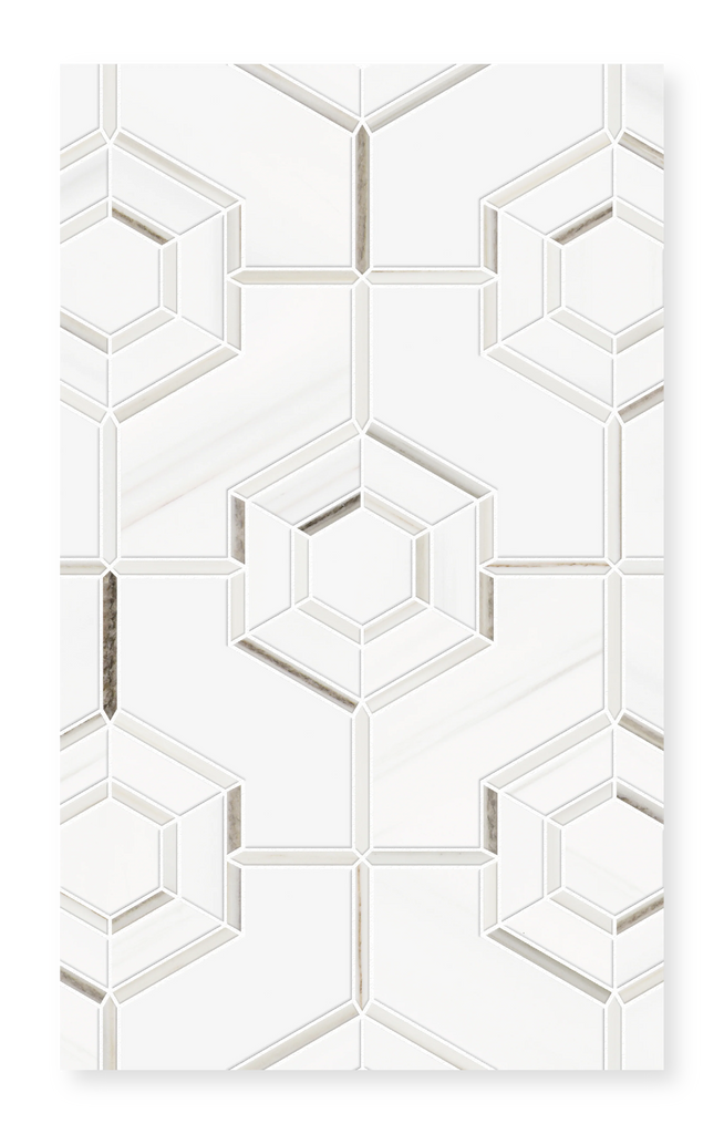 Aurelia is a waterjet and hand-cut marble mosaic by specially trained artisans, showcasing the perfect marriage of precision technology and expert craftsmanship. This exquisite mosaic features honed Bianco Dolomite and polished Italian Calacatta Zebrino for a stunning contrast of textures and finishes.