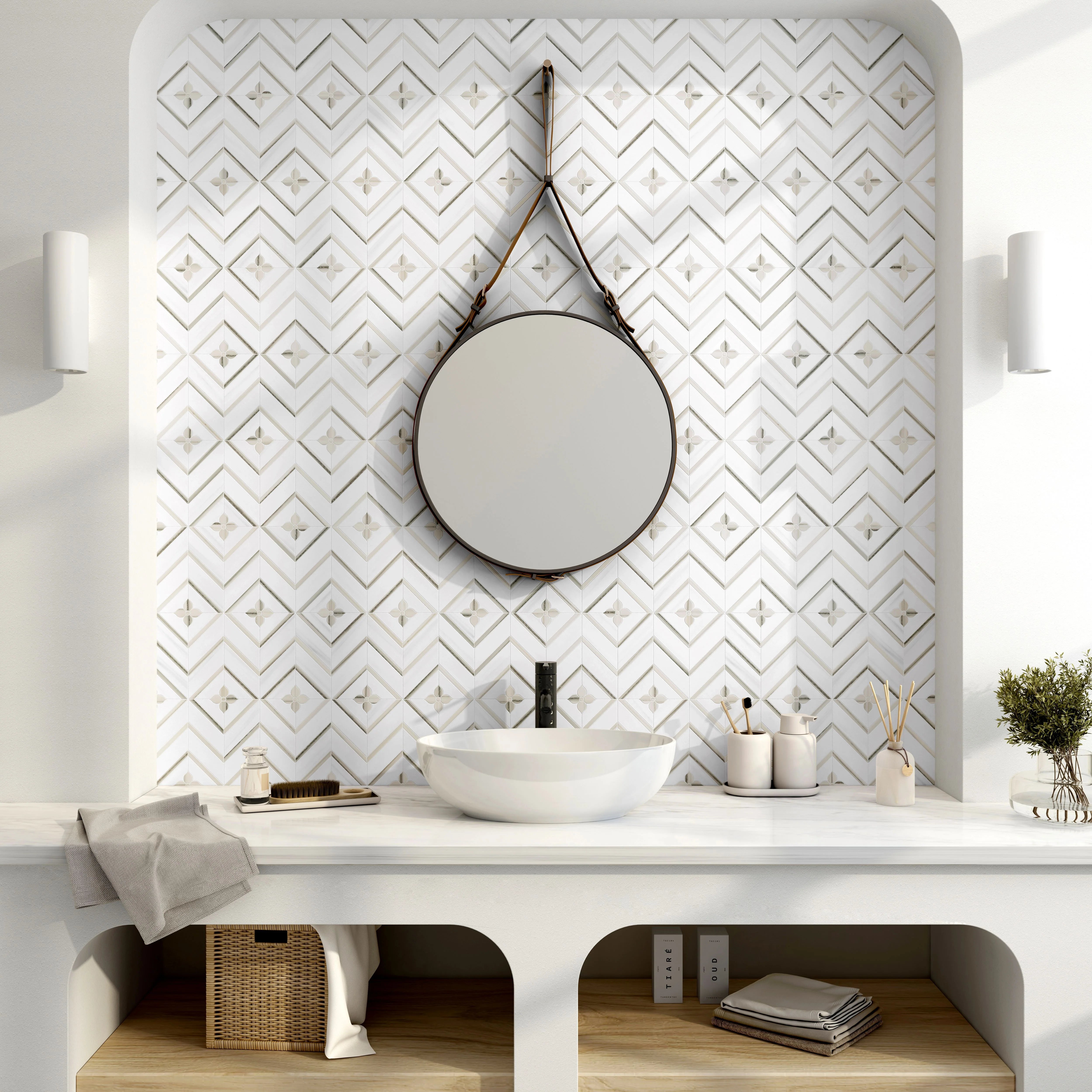 Caldera is a stunning marble mosaic that combines the precision of waterjet technology with the artistry of hand-cutting by specially trained artisans. This unique dual-technique approach creates exceptional detail and craftsmanship, resulting in a truly distinctive mosaic that showcases both modern precision and traditional artisan skill.
