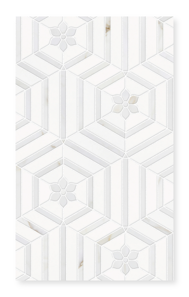 Florence is a stunning marble mosaic featuring White Thassos in a honed finish and Calacatta Gold in a polished finish. This sophisticated combination creates a beautiful interplay of texture and luminosity, bringing timeless elegance and visual depth to any space.