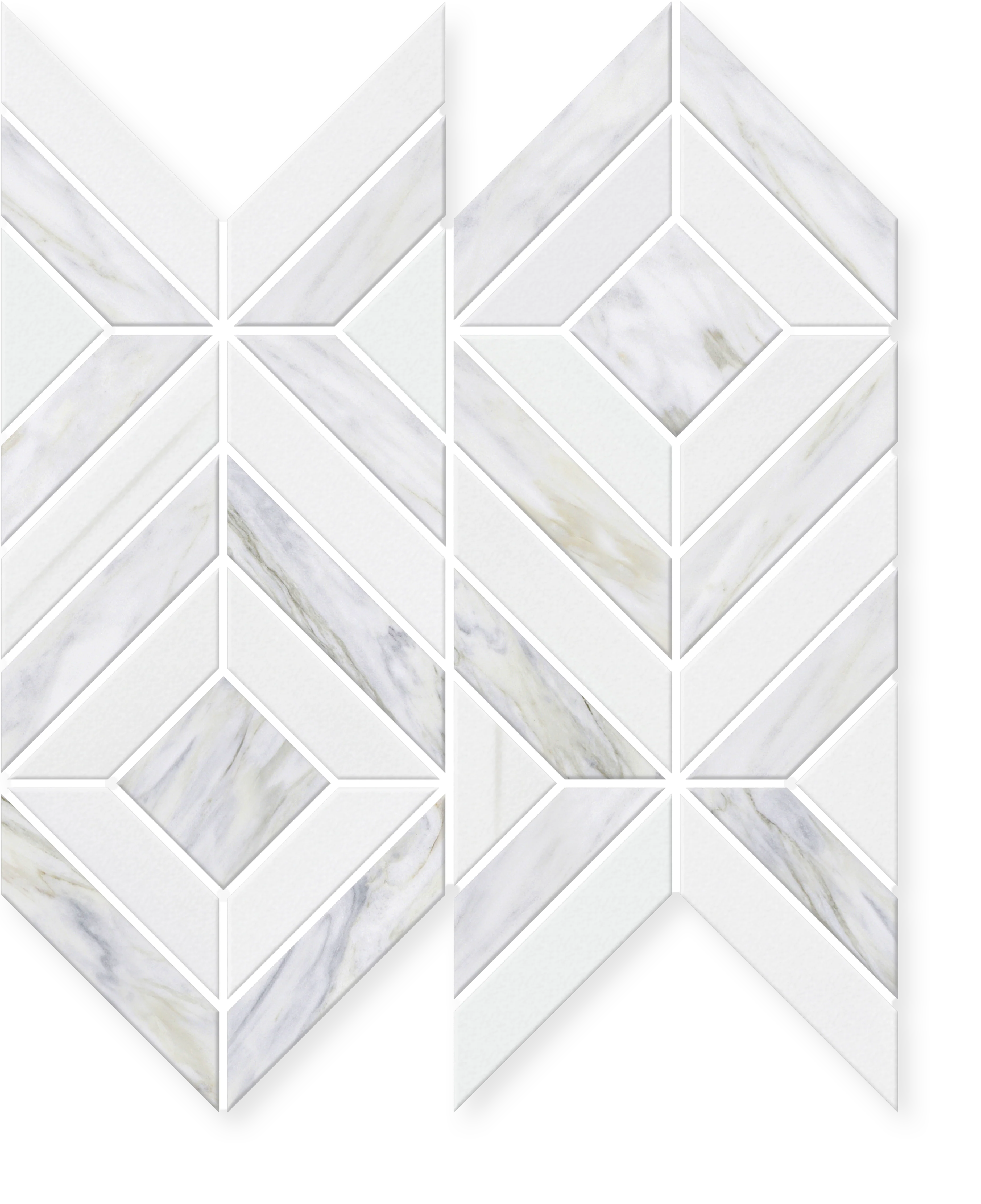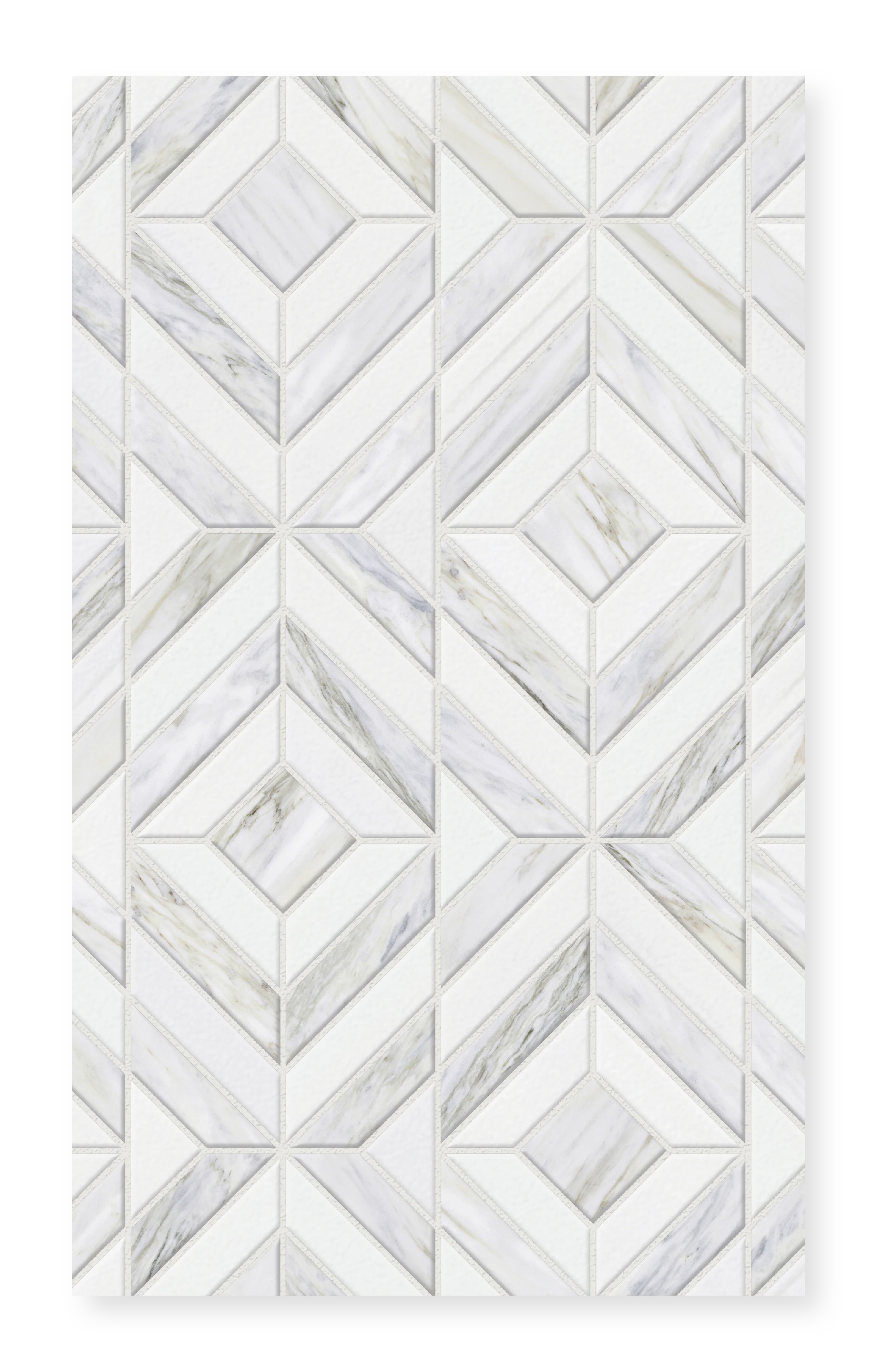 Haven is a hand-cut diamond marble mosaic by specially trained artisans, showcasing the timeless beauty of honed Calacatta Manhattan and Bianco Dolomite. This exquisite mosaic features an elegant diamond pattern that brings sophisticated geometry and natural luxury to any space.
