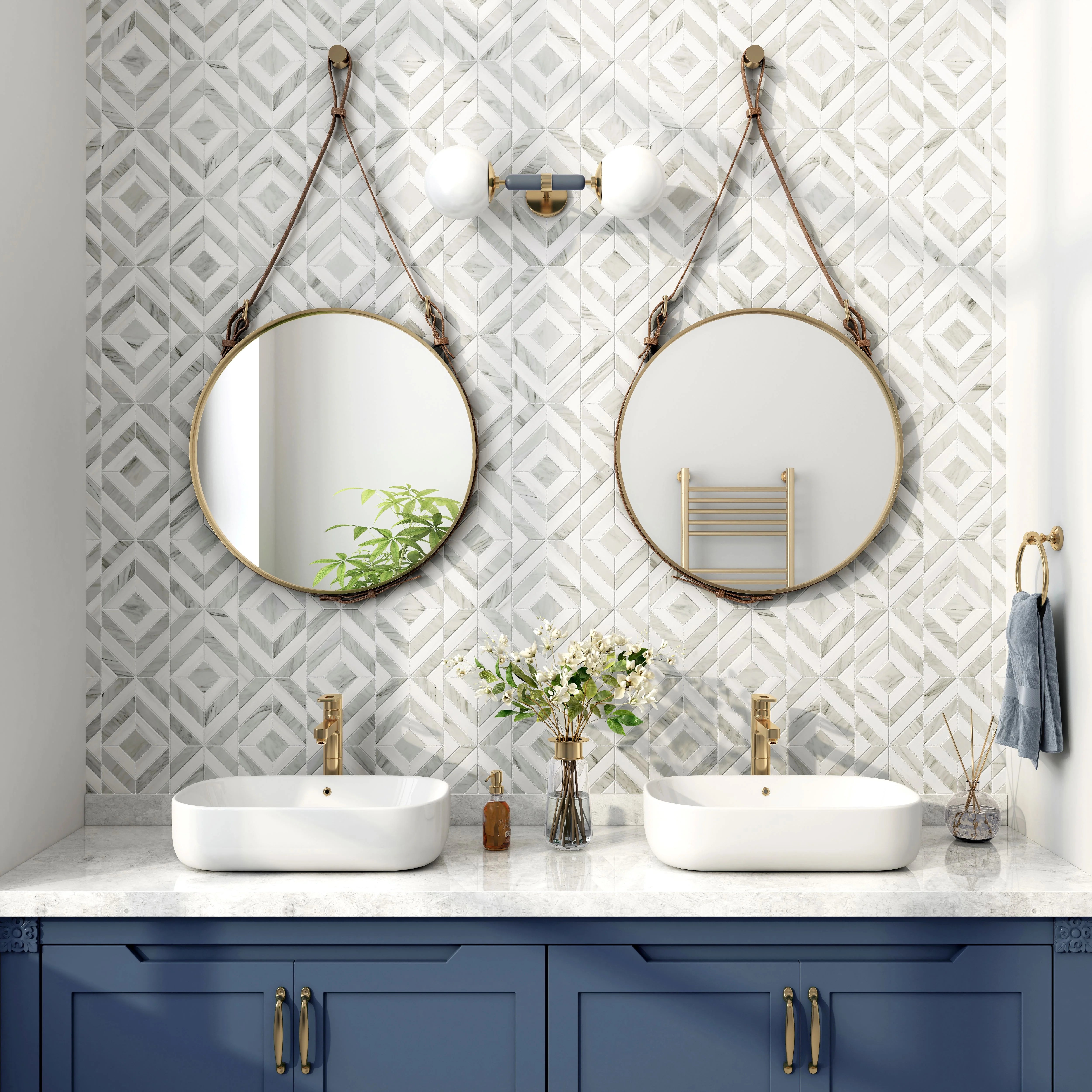Experience the artistry of hand-cut marble with Haven's diamond pattern. Each piece is meticulously crafted by specially trained artisans to create the distinctive geometric design. The combination of Calacatta Manhattan's elegant veining with the subtle beauty of Bianco Dolomite creates a harmonious blend of luxury and natural sophistication. The honed finish provides a soft, matte appearance that enhances the timeless diamond pattern while offering durability for both residential and commercial medium-duty applications.