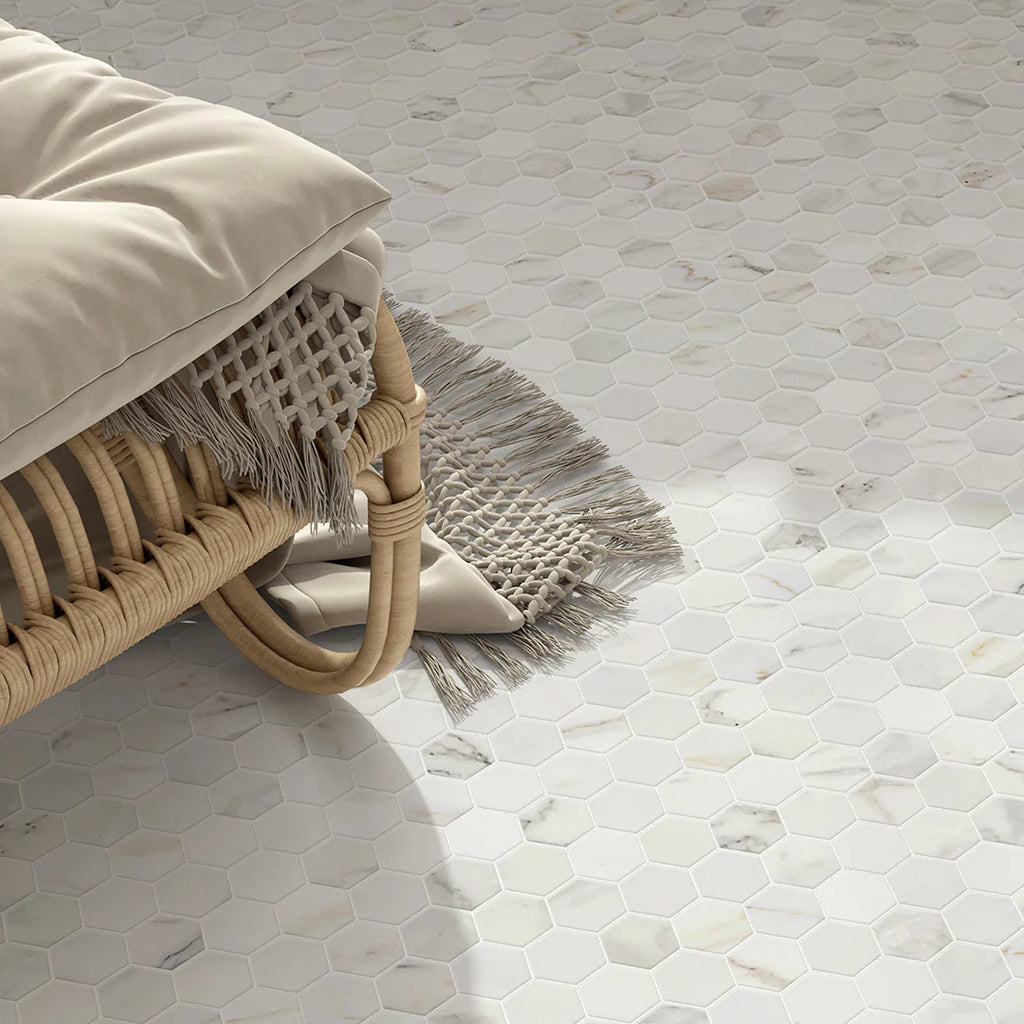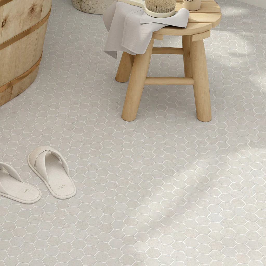 Hexagon Mosaic 4cm is an exquisite hand-cut marble mosaic crafted by specially trained artisans. Each piece showcases exceptional skill and attention to detail, featuring eight premium marble and limestone varieties with varied finishes that create a sophisticated hexagonal design with rich color variation and textural depth.