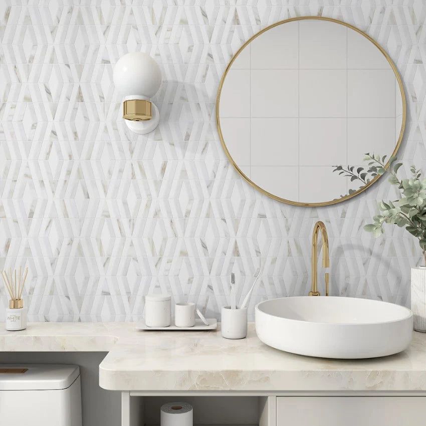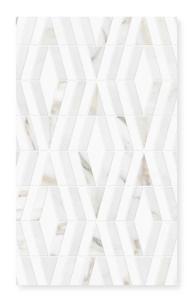 Lucente is an exquisite hand-cut marble mosaic crafted by specially trained artisans. Each piece showcases exceptional skill and attention to detail, combining two premium marble varieties in luminous polished finishes that create a sophisticated and radiant design.