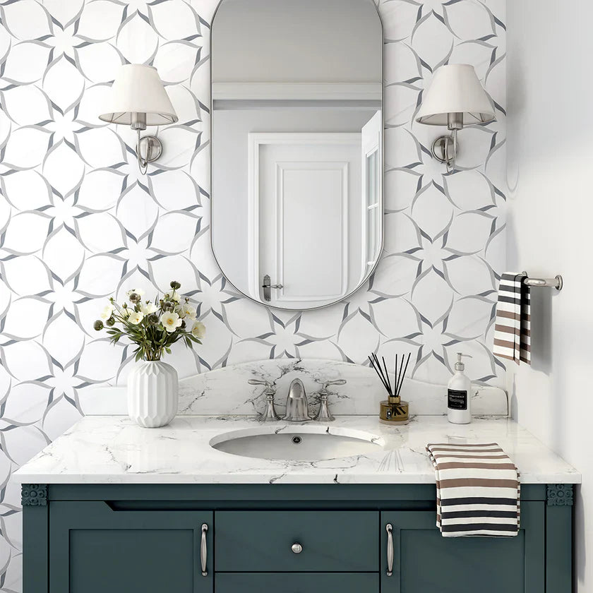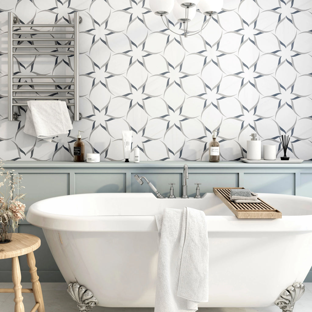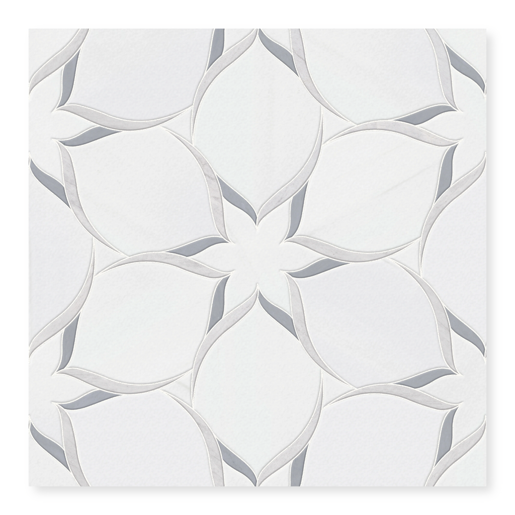 Exquisite. Intricate. Timeless. Our Lunara waterjet marble mosaic transforms any space into a work of art. Each piece is precision-cut using advanced waterjet technology, combining honed Bianco Dolomite, Lais Grey, and Bardiglio Imperial marble. The sophisticated pattern creates a stunning interplay of white and grey tones that elevates interiors, floors, showers, fireplace surrounds, and exterior walls designed to captivate.
