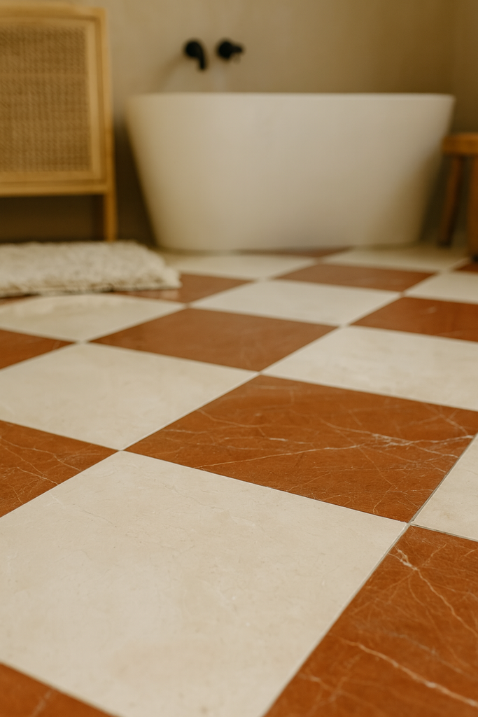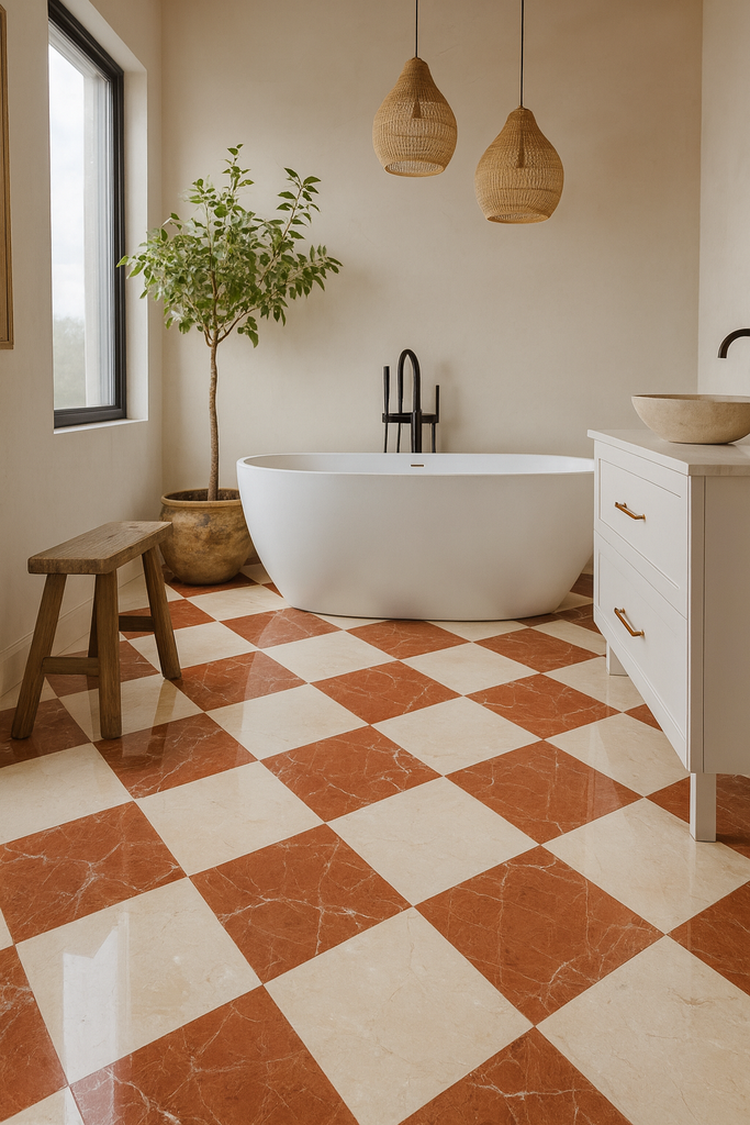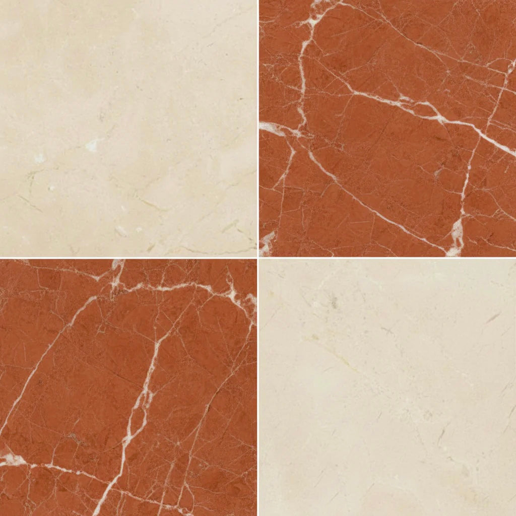 Iconic. Bold. Timeless. Our Rojo Alicante and Crema Marfil Select marble checkerboard tile brings instant drama and elegance to any space. Warm Crema Marfil Select squares contrast flawlessly against deep Rojo Alicante red, creating a floor that's both classic and statement-making. Precision-cut and finished for luxury interiors, it's perfect for kitchens, entryways, and living spaces designed to impress.
