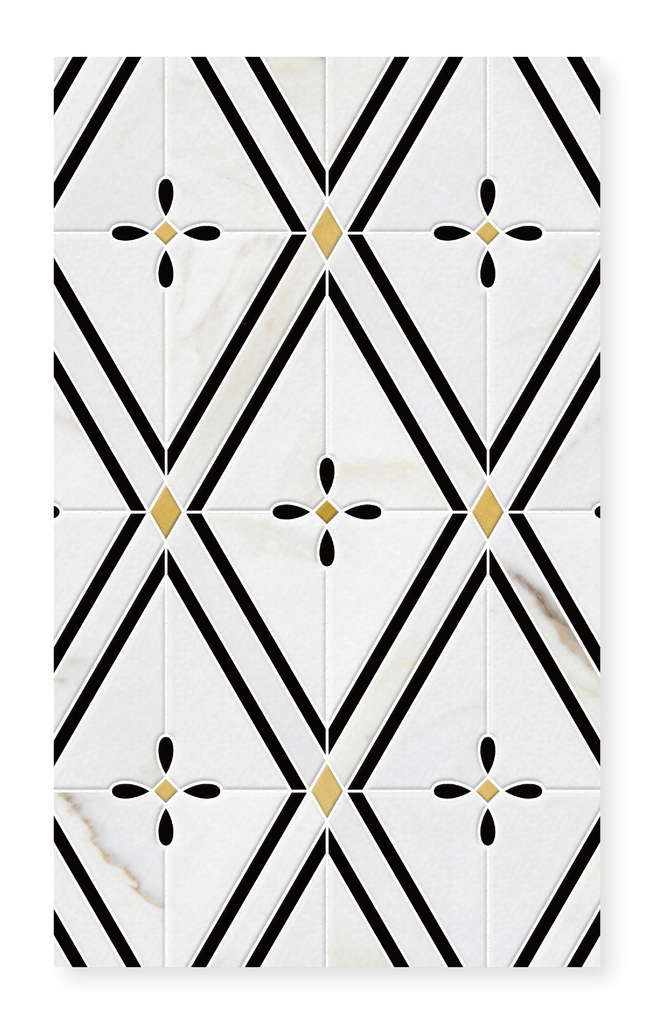 Rocella is a stunning marble mosaic featuring Calacatta Gold and China Black in honed finishes, beautifully complemented by brushed brass accents. This sophisticated combination creates a contemporary design with warmth and visual interest, perfect for making a bold statement in interior spaces.
