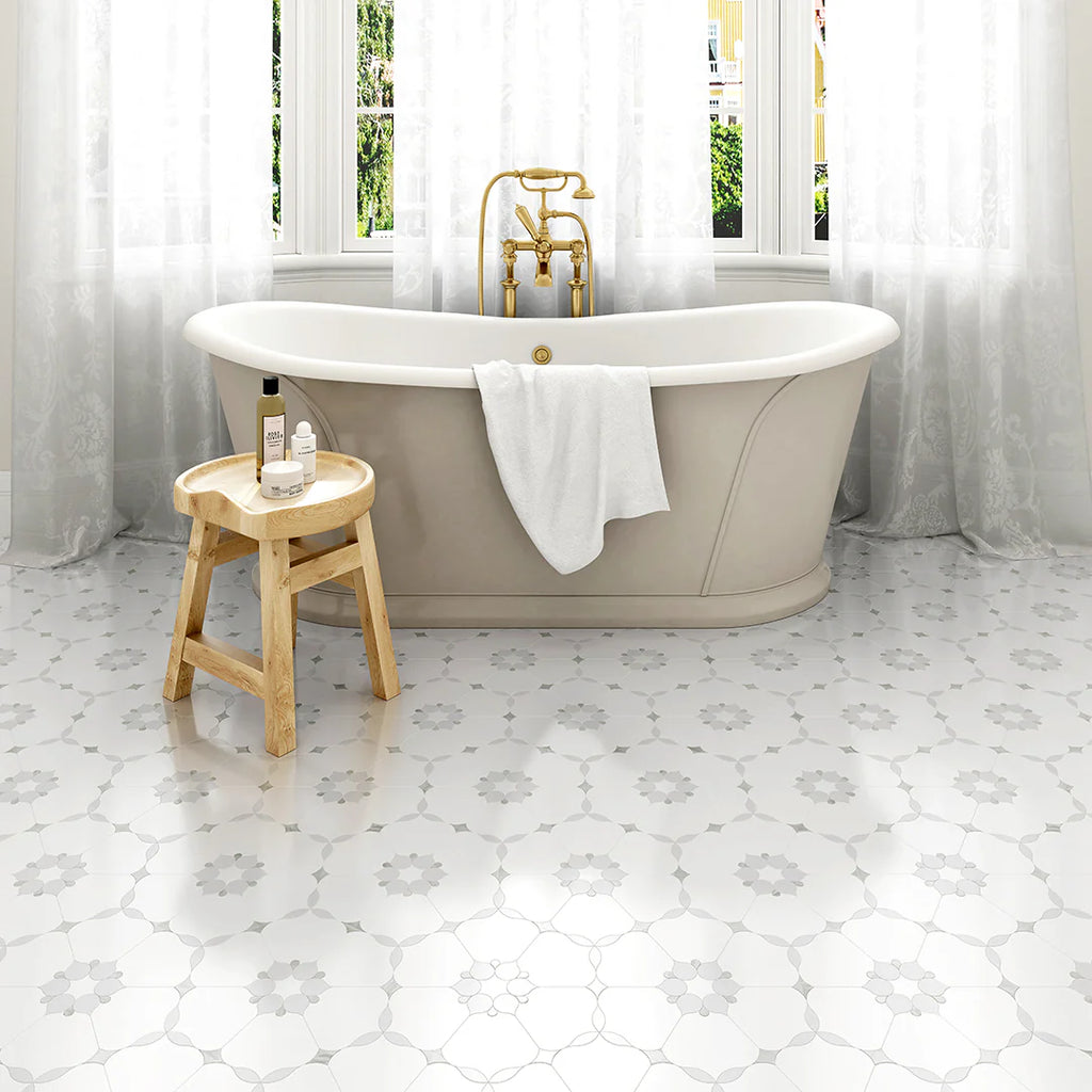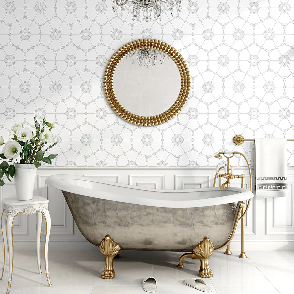 Exquisite. Intricate. Timeless. Our Thassian Bloom waterjet marble mosaic transforms any space into a work of art. This stunning floral-inspired pattern features precision-cut premium marbles and mother of pearl, creating an elegant geometric design that captures the eye and elevates your interior.