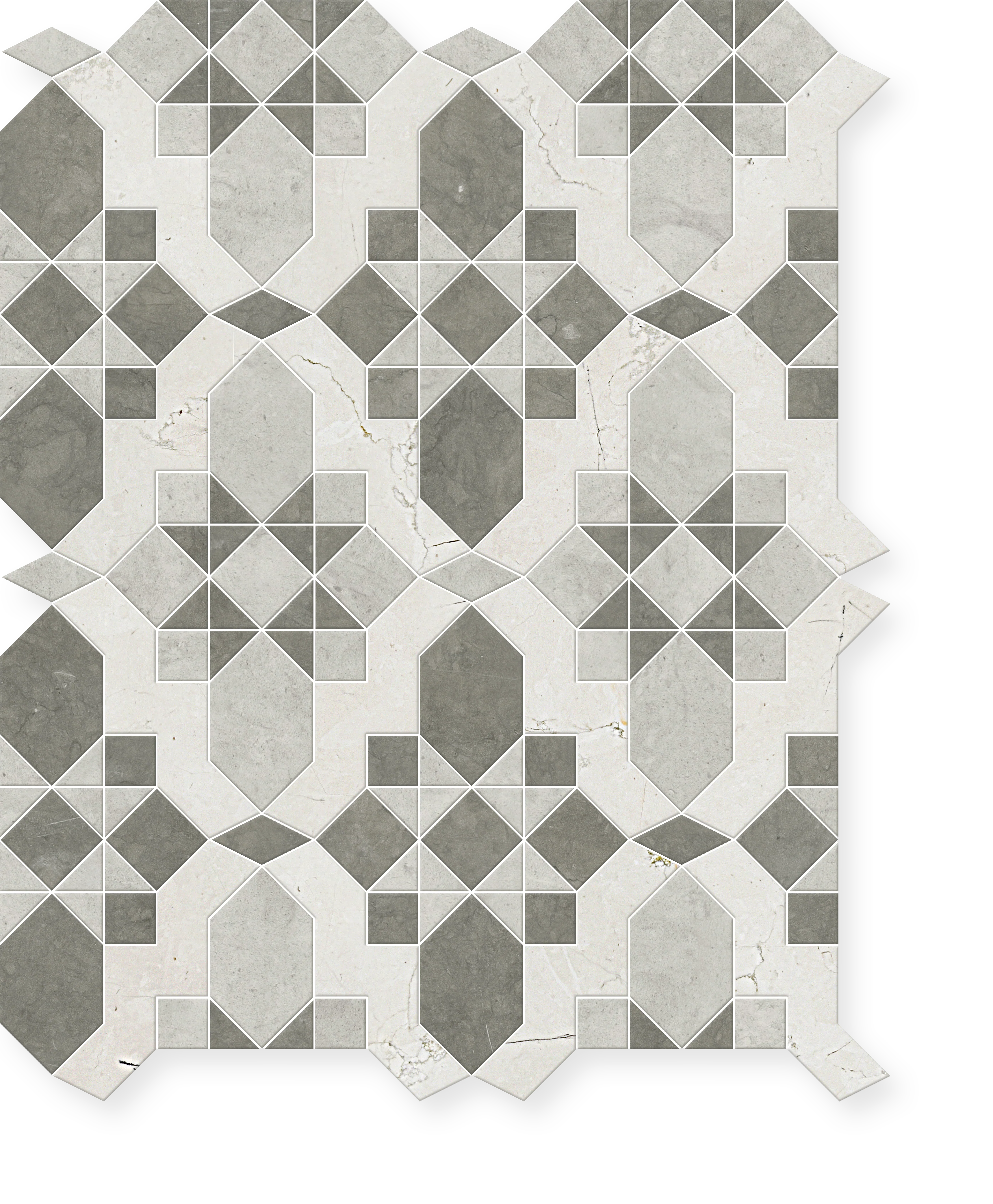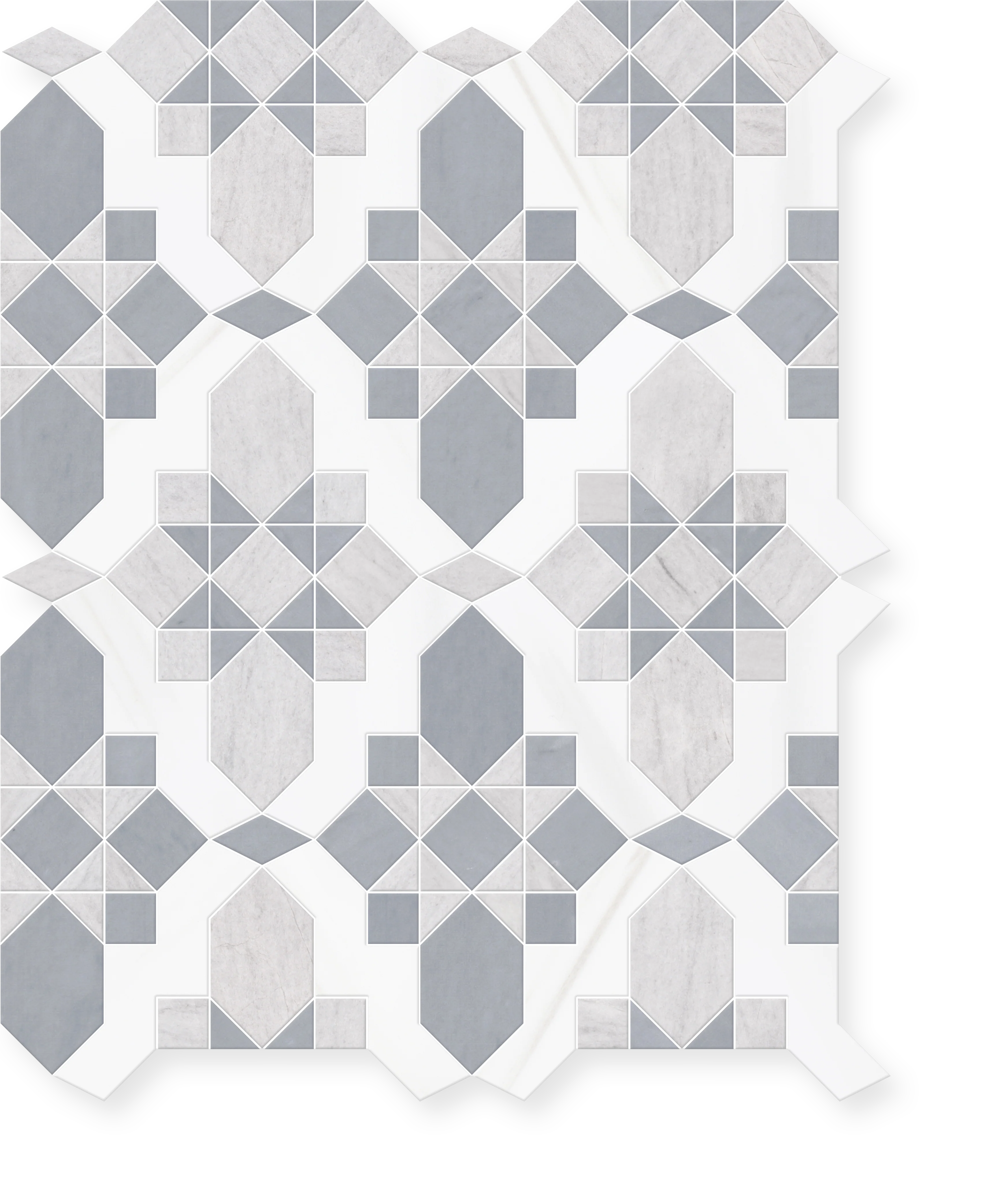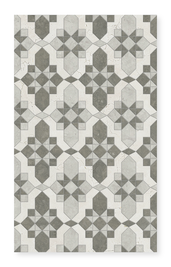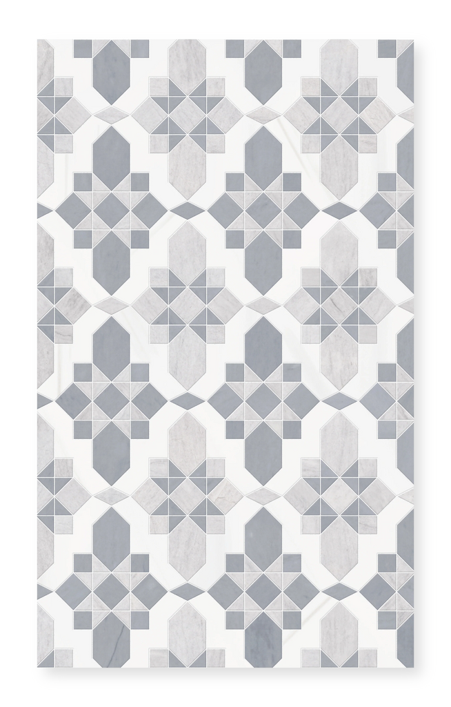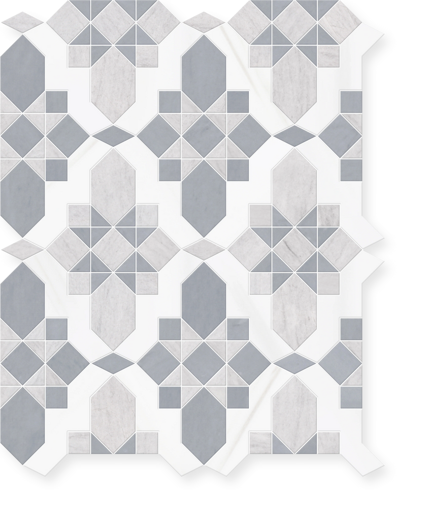 Valencia is a stunning marble mosaic that combines the precision of waterjet technology with the artistry of hand-cutting by specially trained artisans. This elegant design is available in two sophisticated color palettes, each featuring three premium marble varieties in harmonious honed finishes.
