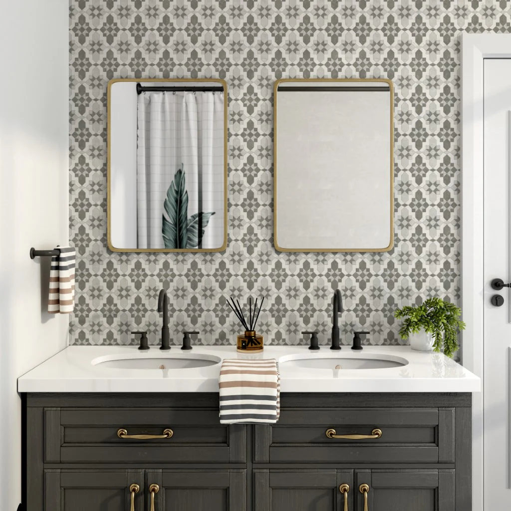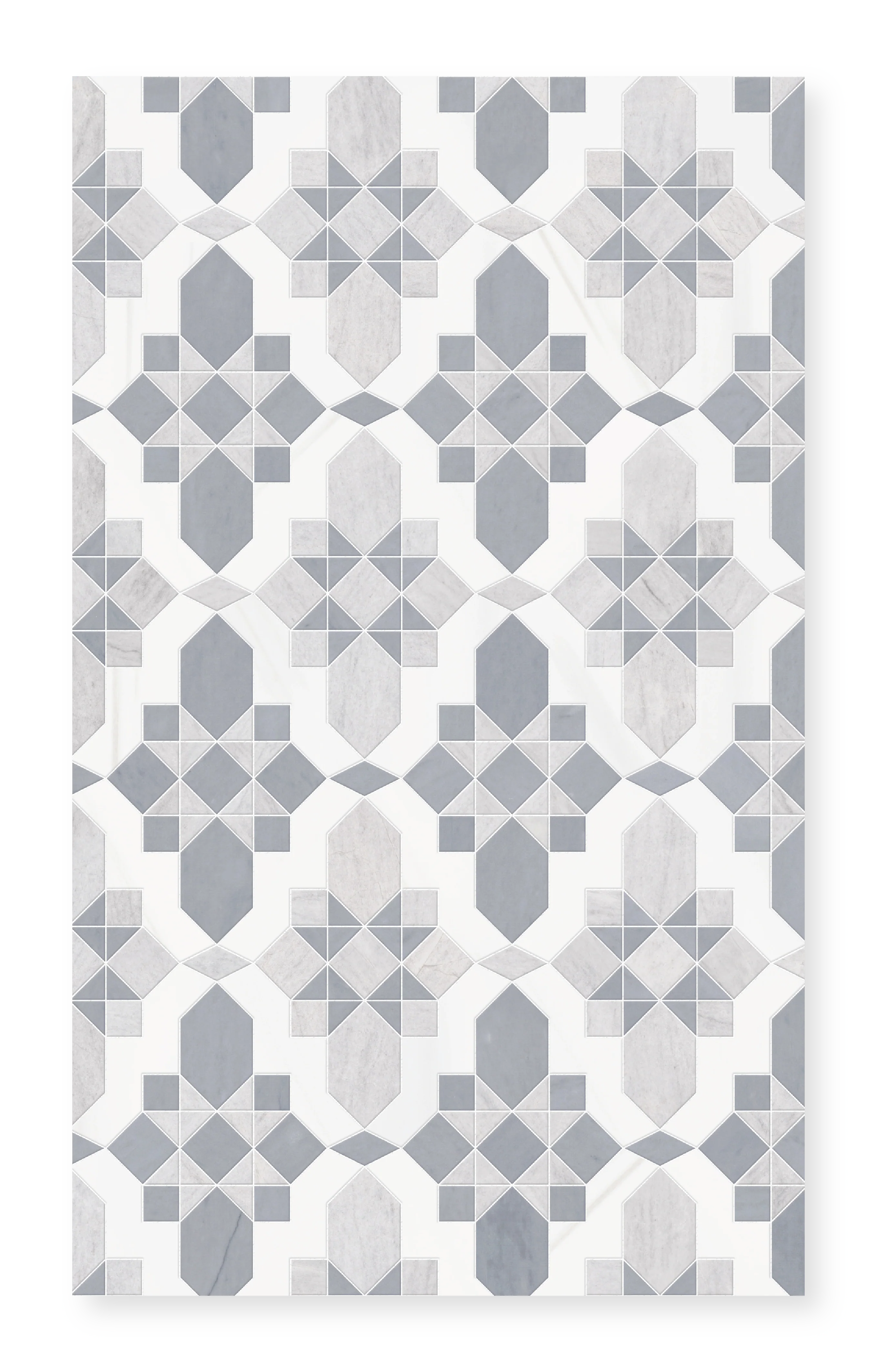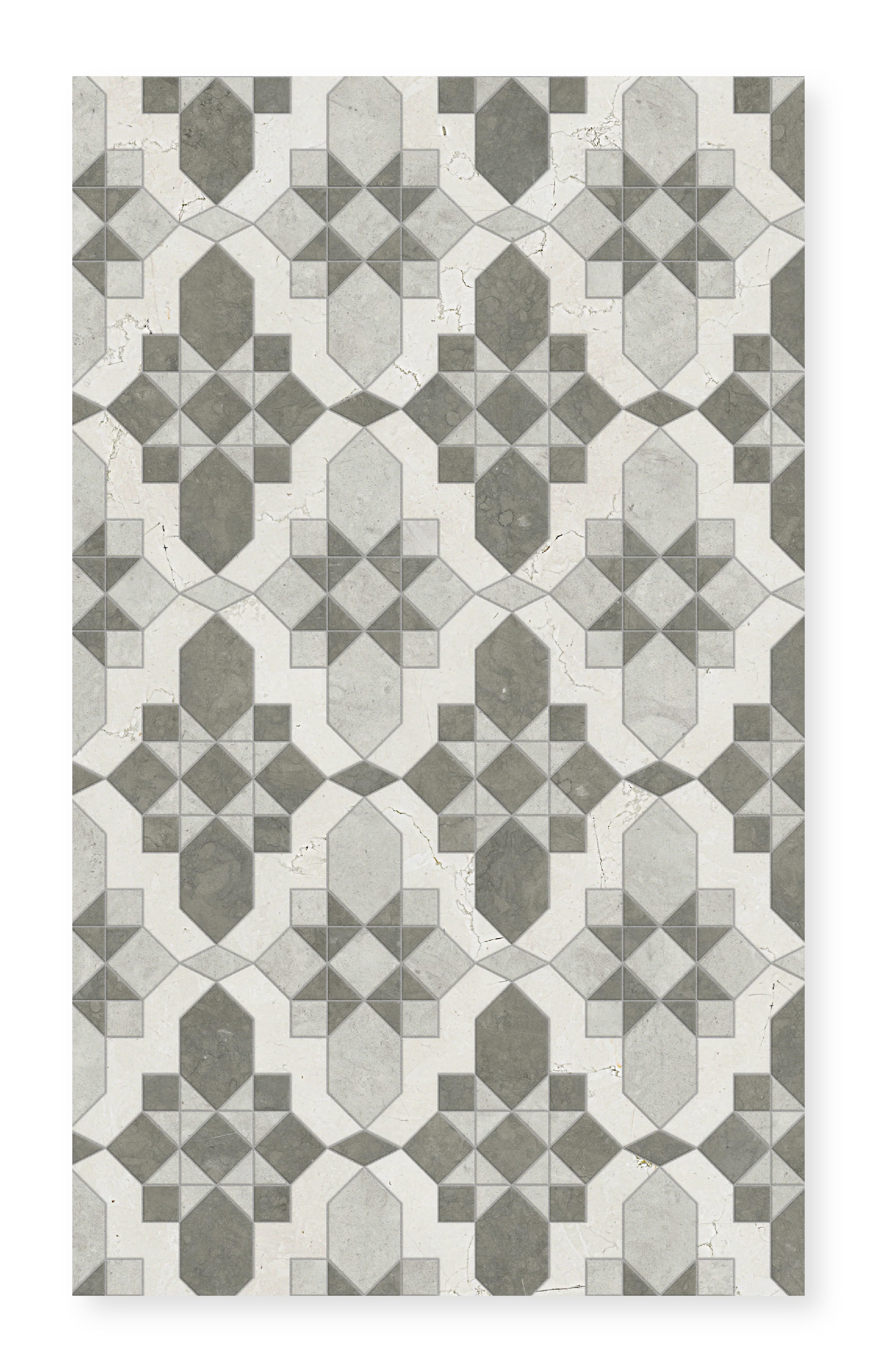 Valencia is a stunning marble mosaic that combines the precision of waterjet technology with the artistry of hand-cutting by specially trained artisans. This elegant design is available in two sophisticated color palettes, each featuring three premium marble varieties in harmonious honed finishes.