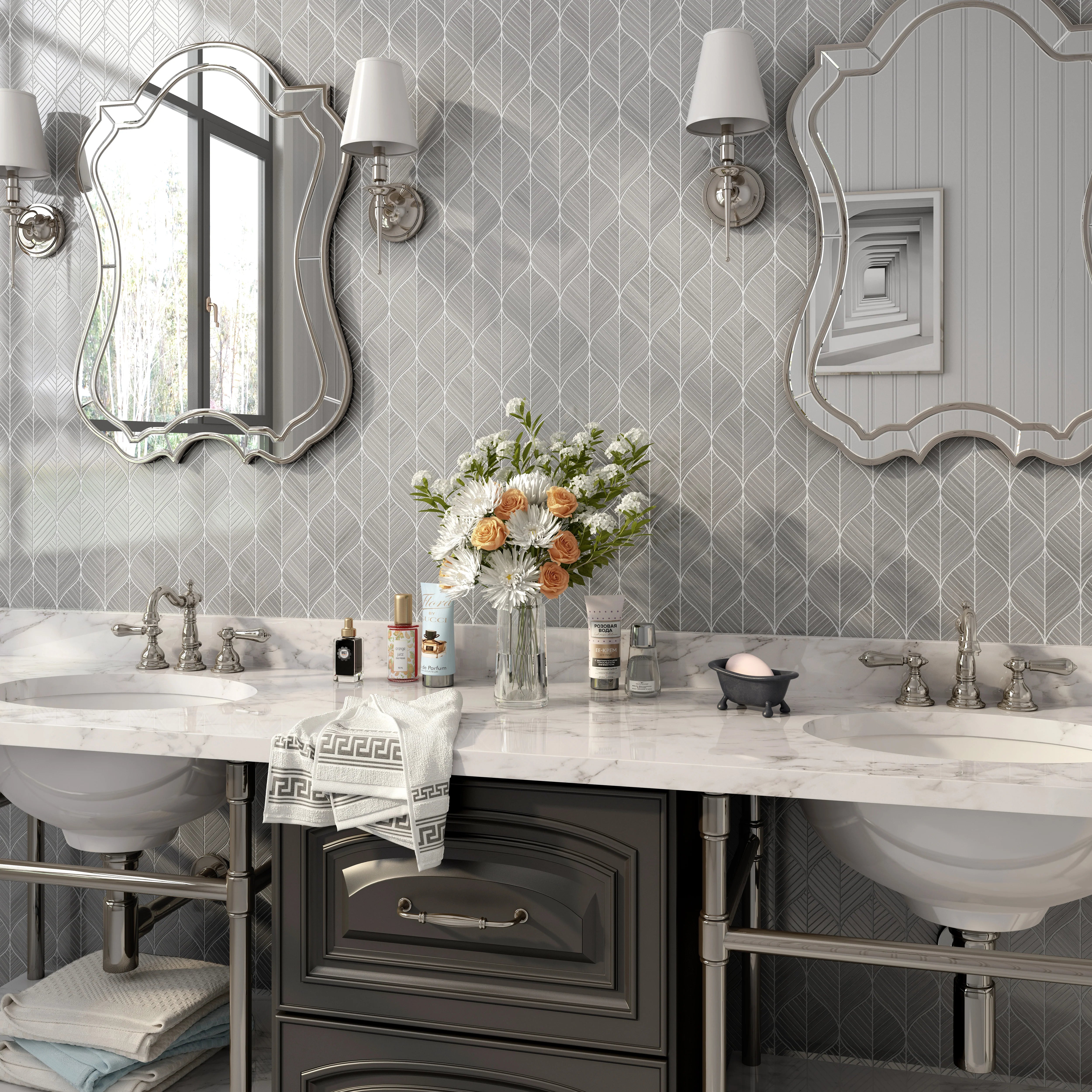Verdura is a sophisticated waterjet marble mosaic cut by high-precision machinery, ensuring flawless geometric patterns and exceptional quality. This elegant mosaic showcases the natural beauty of premium marble with cutting-edge manufacturing precision.