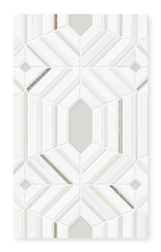 - Materials: Bianco Dolomite, Calacatta Zebrino, Foggy Autumn Glass